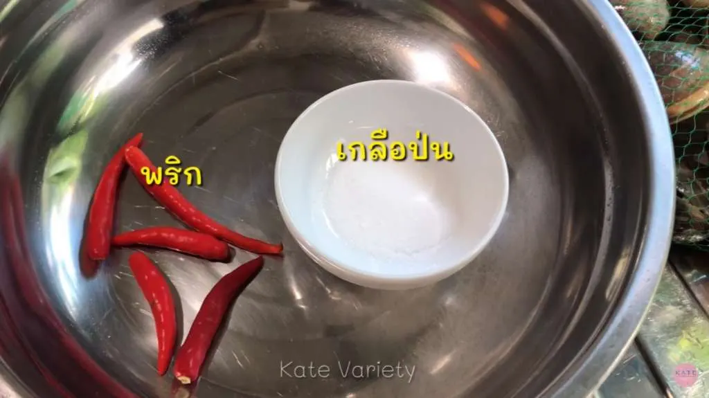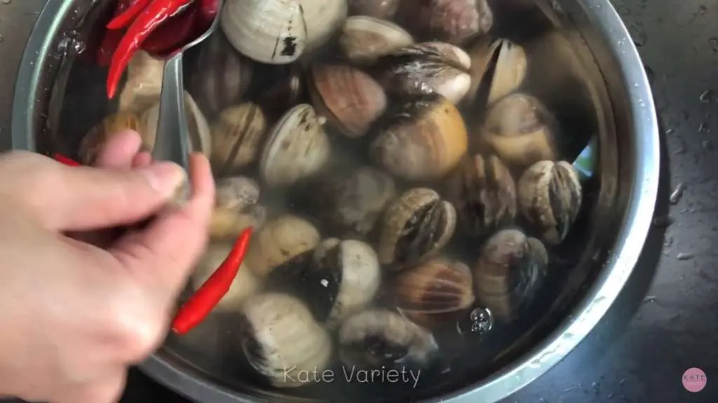 สิ่งที่เราจะใช้ หาได้จากในครัวเลยค่ะ นั่นก็คือ เกลือป่น และ พริก ค่ะ นำเกลือป่นละลายในน้ำพร้อมกับพริกที่เราบุบไว้ และนำหอยลงไปแช่ แช่ทิ้งไว้ 15 นาที สังเกตว่าหอยจะอ้าปากออก เพราะเกิดความระคายเคืองจากเกลือและพริก ทำให้หอยอ้า คายดินทรายออกมา