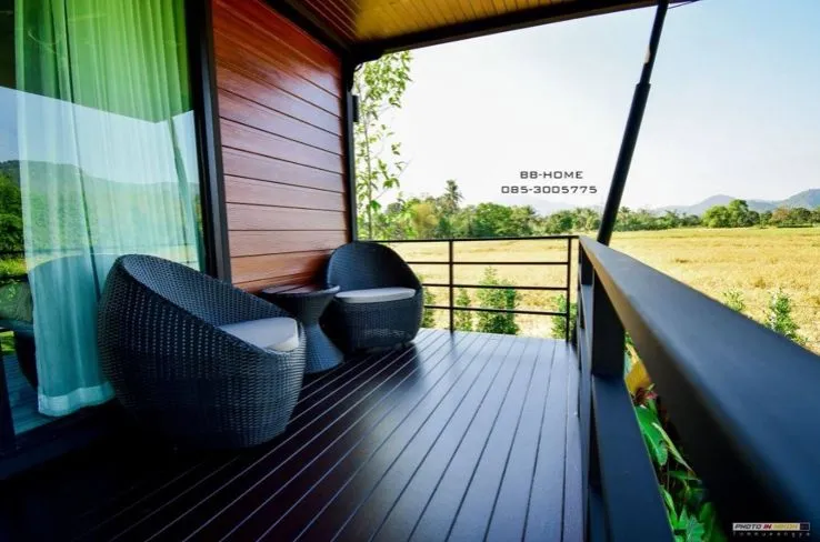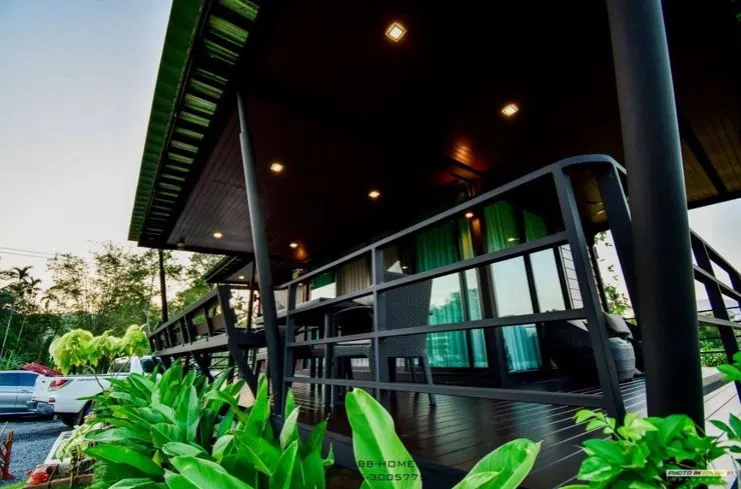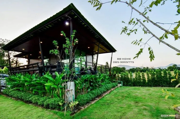 พื้นของตัวบ้านยกสูง มีเฉลียงหน้าบ้าน พื้นที่ใช้สอยเพียงพอต่อการทำกิจกรรมกับคนที่เรารัก แลดูภายนอกใช้สีที่เข้ม แน่นอนว่าให้ความรู้สึกที่อบอุ่น แข็งแรง พื้นที่ภายนอกมองไปทางด้านใหนก็เขียวสบายตา