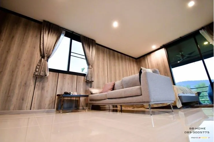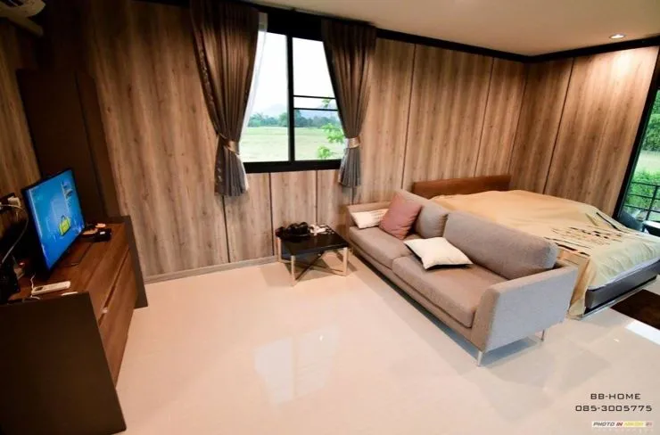 ภายในบ้านประกอบไปด้วยเครื่องอำนวยความสะดวกอย่างครบครัน ตกแต่งดูหรูหรามากๆ เตียงนอนนุ่มๆ โซฟาอันน่านั่ง ผ้าม่านเปิดไว้รับแสงจากธรรมชาติ ฝ้าด้านบนใช้แบบเรียบ หลอดไฟตกแต่งได้เหมาะสม ลงตัว