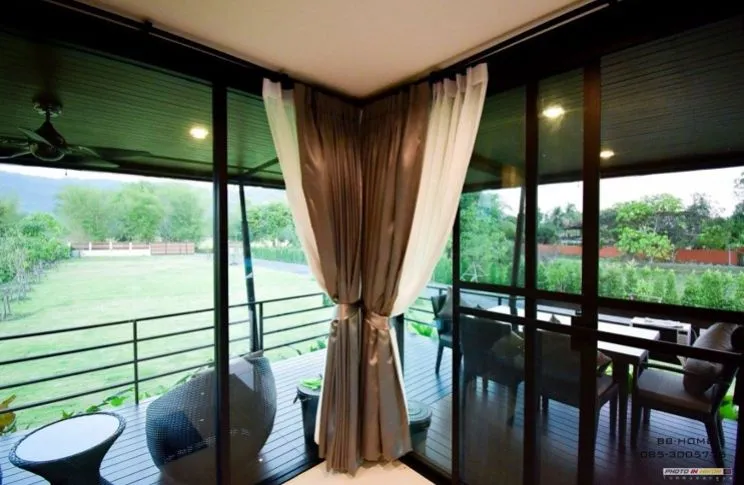 เฉลียงหน้าบ้านพื้นที่นั่งพัก หรือพบปะกับแขกทำกิจกรรมตรงนี้ ก็เหมาะดีนัก ไม่เพียงเท่านี้ ผู้เขียนลองจินตนาการว่านั่งตรงที่นั่งนี้ มีเครื่องดื่มหวานๆ มีลมพัดผ่านเบาๆ เอาความหอมของดอกไม้ ใบใม้เขียวๆ มาด้วย แล้วมองออกมาชมทิวทัสน์ คงจะสบายไม่น้อย