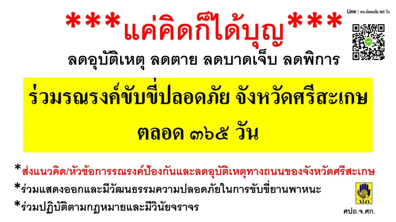 เมื่อวันที่ 24 พ.ย. 62 ผู้สื่อข่าวรายงานว่า ที่ศาลากลาง จ.ศรีสะเกษ อ.เมือง จ.ศรีสะเกษ นายบุญประสงศ์ นวลสายย์ หัวหน้าสำนักงานป้องกันและบรรเทาสาธารณะภัยจังหวัดศรีสะเกษ กล่าวว่า นายวัฒนา พุฒิชาติ ผวจ.ศรีสะเกษ ได้มอบหมายให้สำนักงานป้องกันและบรรเทาสาธารณะภัยจังหวัดศรีสะเกษ กำหนดประเด็นหรือหาวิธีการเชิญชวนพี่น้องประชาชนรวมทั้งทุกหน่วยงาน ส่งความเห็นหัวข้อในการรณรงค์มาที่จังหวัดศรีสะเกษ เพื่อที่จะได้มากำหนดเป็นประเด็นในการขับเคลื่อนเรื่องอุบัติเหตุตลอด 365 วัน ซึ่งเป็นส่วนหนึ่งที่ทางสำนักงานป้องกันและบรรเทาสาธารณะภัยจังหวัดศรีสะเกษ ได้มองว่า การรณรงค์ความเห็นก็เป็นส่วนหนึ่งของการคิดร่วมรณรงค์ แค่คิดท่านก็ได้บุญ การรณรงค์ลดอุบัติเหตุ ลดตาย ลดบาดเจ็บ ลดพิการ ในพื้นที่ จ.ศรีสะเกษ ร่วมรณรงค์ขับขี่ปลอดภัยจังหวัดศรีสะเกษ ตลอด 365 วัน ตัวอย่างความคิดเห็นเช่นยุทธการเด็ดปีกแมงขี้นาคของศรีสะเกษเองก็มีหลายประเด็นคงจะต้องมีผู้ที่มีภูมิความรู้ระดมความเห็นกัน ซึ่งก็จะไปเชื่อมโยงกับการรณรงค์ 7 วันแห่งการขับขี่ปลอดภัย 2563 นี้ด้วย ซึ่ง จ.ศรีสะเกษ ได้กำหนดขึ้นในวันที่ 27 ธันวาคม 2562 ถึงวันที่ 3 มกราคม 2563 โดยจะใช้มาตรการที่ท่าน ผวจ.ศรีสะเกษระดมความคิดเห็น เพื่อสร้างกระแสและขับเคลื่อน ในช่วงปีใหม่ที่มาถึงนี้