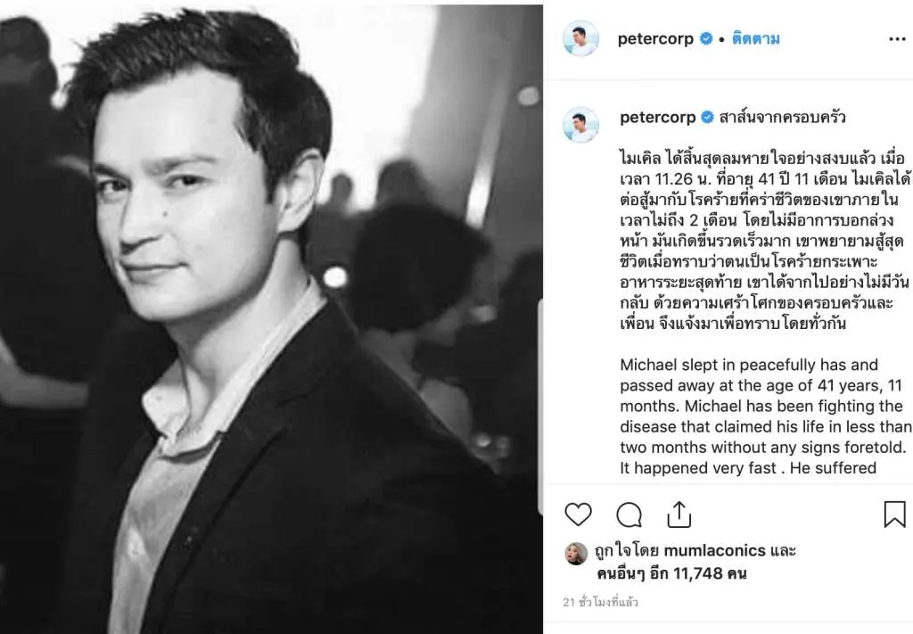 จากนั้น “ปีเตอร์ คอร์ป”ได้โพสต์ภาพน้องชาย พร้อมกับแคปชั่นว่า “สาส์นจากครอบครัวไมเคิลได้สิ้นสุดลมหายใจอย่างสงบแล้วเมื่อเวลา 11.26 น. ที่อายุ 41 ปี 11 เดือนไมเคิลได้ต่อสู้มากับโรคร้ายที่คร่าชีวิตของเขาภายในเวลาไม่ถึง 2 เดือนโดยไม่มีอาการบอกล่วงหน้ามันเกิดขึ้นรวดเร็วมากเขาพยายามสู้สุดชีวิตเมื่อทราบว่าตนเป็นโรคร้ายกระเพาะอาหารระยะสุดท้ายเขาได้จากไปอย่างไม่มีวันกลับด้วยความเศร้าโศกของครอบครัวและเพื่อนจึงแจ้งมาเพื่อทราบโดยทั่วกัน