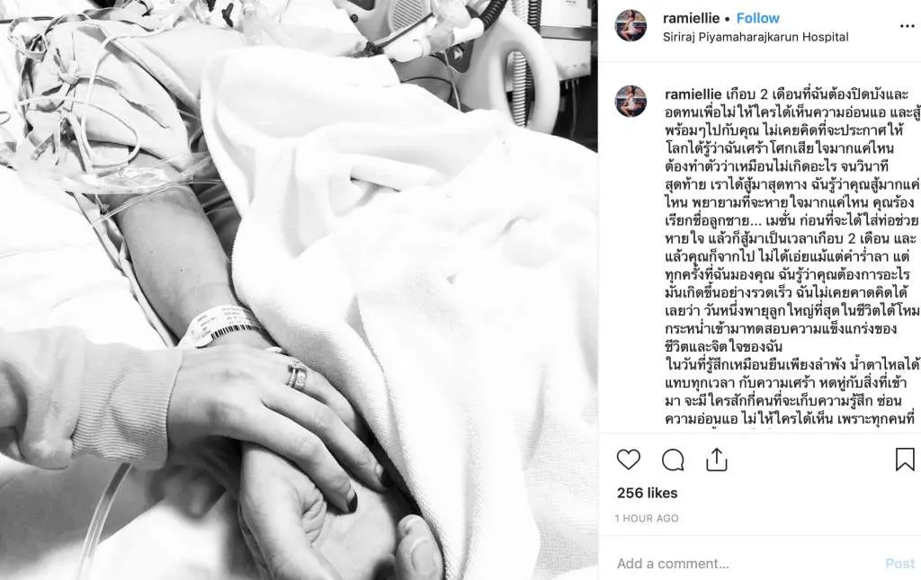 “เกือบ 2 เดือนที่ฉันต้องปิดบังและอดทนเพื่อไม่ให้ใครได้เห็นความอ่อนแอ และสู้พร้อมๆไปกับคุณ ไม่เคยคิดที่จะประกาศให้โลกได้รู้ว่าฉันเศร้าโศกเสียใจมากแค่ไหน ต้องทำตัวว่าเหมือนไม่เกิดอะไร จนวินาทีสุดท้าย เราได้สู้มาสุดทาง ฉันรู้ว่าคุณสู้มากแค่ไหน พยายามที่จะหายใจมากแค่ไหน คุณร้องเรียกชื่อลูกชาย… เมซั่น ก่อนที่จะได้ใส่ท่อช่วยหายใจ แล้วก็สู้มาเป็นเวลาเกือบ 2 เดือน และแล้วคุณก็จากไป ไม่ได้เอ่ยแม้แต่คำร่ำลา แต่ทุกครั้งที่ฉันมองคุณ ฉันรู้ว่าคุณต้องการอะไร มันเกิดขึ้นอย่างรวดเร็ว ฉันไม่เคยคาดคิดได้เลยว่า วันหนึ่งพายุลูกใหญ่ที่สุดในชีวิตได้โหมกระหน่ำเข้ามาทดสอบความแข็งแกร่งของชีวิตและจิตใจของฉัน ในวันที่รู้สึกเหมือนยืนเพียงลำพัง น้ำตาไหลได้แทบทุกเวลา กับความเศร้า หดหู่กับสิ่งที่เข้ามา จะมีใครสักกี่คนที่จะเก็บความรู้สึก ซ่อนความอ่อนแอ ไม่ให้ใครได้เห็น เพราะทุกคนที่มองเรานั้น มองไปในทางเดียวกันว่า “ผู้หญิงคนนั้นช่างเข้มแข็งและยืนอยู่ได้อย่างไรในวันที่พายุลูกใหญ่พัดเข้ามาในชีวิตเธอขนาดนี้” ฉันได้แต่จ้องมองคนนี้ … สามี และมองคนๆนั้น … ลูกน้อย แล้วบอกตัวเองว่า นี่เรามาถึงจุดๆนี้ได้อย่างไร จุดที่คำว่าจะเอาไฟมาเผา หรือยิงปืนเข้าที่อกฉัน ฉันจะไม่มีความกลัว หรือความเจ็บปวดใดๆ เพราะจากนี้ไป จะไม่มีอะไรที่มาทำให้ฉันกลัวได้อีก “ ฉันรู้ในใจ ว่าฉันจะรักษา หรือปล่อยเค้าไปจากชีวิต ฉันจะสู้ ไม่ใช่เพื่อฉันเอง แต่เพื่อคุณกับลูก คิดถึงสามีเหลือเกิน”