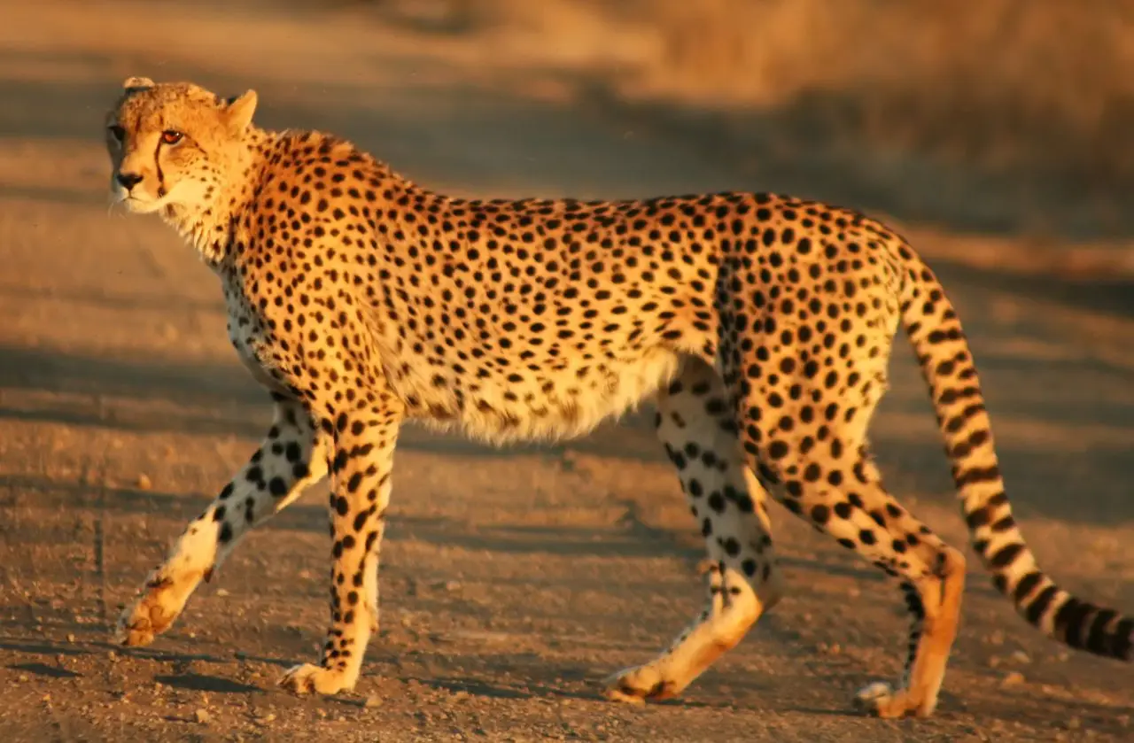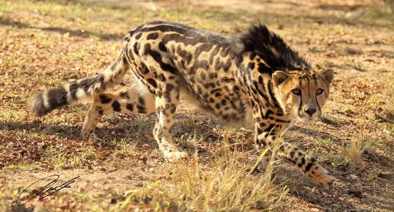 เสือชีตาห์ ที่ได้ชื่อว่าเป็น King เหลือจำนวนอยู่น้อยเต็มที่ ....นับเป็นสัตว์ที่วิ่งได้เร็วระดับโลก เส้นดำพาดหลังเป็นลายของมัน ....ถูกระบุว่า เป็นผลจากการกลายพันธุ์ทาพันธุกรรม