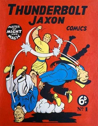 สำหรับการกำเนิดการ์ตูนสัญชาติอังกฤษเรื่อง Thunderbolt Jaxon ช่วงนั้นสงครามโลกครั้งที่ 2 พึ่งจบลง ทำให้กระดาษขาดแคลน การคงอยู่ของค่ายหนังสือการ์ตูนก็ระส่ำระส่ายไปตามๆกัน อีกทั้ง Comic จากอเมริกาได้เข้ามาบุกตลาด ทำให้ Edward Holmes บรรณาธิการ Knockout Comics ได้ใช้แรงบันดาลใจจาก Captain marvel (Shazam) มาสร้างเป็น Thunderbolt Jaxon และส่งออกไปยังประเทศออสเตรเลียที่เป็นตลาดการ์ตูนขนาดใหญ่ของอังกฤษ ทำให้ตัวละครนี้ปรากฎตัวครั้งแรกในประเทศออสเตรเลีย ก่อนที่จะถูกนำมาขายในอังกฤษอีกที แต่ก็สามารถโลดแล่นได้ไม่นานนัก