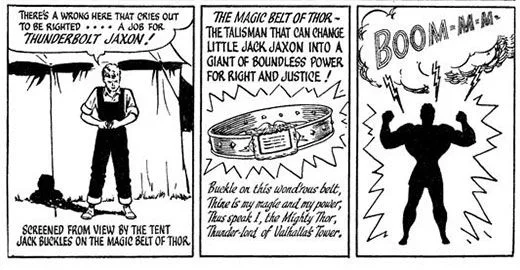 ตามประวัติของ Thunderbolt Jaxon เขาเป็นเด็กกำพร้าชาวอังกฤษนาม Jack Jaxon เขาถูกป้ายสีในอาชญากรรมที่ไม่ได้ก่อ จนถูกส่งตัวไปอยู่ในโรงเรียนดัดสันดาน หลังจากนั้นเขาก็ได้ไปเจอเข็มขัดโบราณรูปทรงประหลาดที่เมื่อสวมใส่ไปแล้วจะแปลงร่างเป็นชายร่างใหญ่ ที่มีพลังและเวทมนตร์ของThor เทพเจ้าสายฟ้าในตำนานเทพปกรณัมนอร์ส Jack ได้ใช้พลังนั้นเพื่อพิสูจน์ความบริสุทธิ์ของตัวเอง และจัดการลุงที่มาใส่ความเขาให้เข้าสู่กระบวนการยุติธรรม ก่อนจะออกไปช่วยเหลือผู้อื่นต่อไป