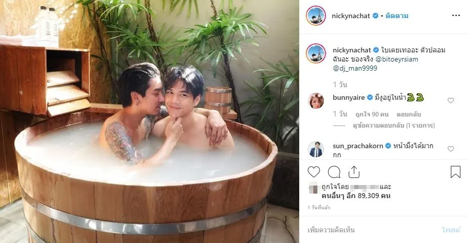 และล่าสุดทางด้าน นิกกี้ ได้ออกมาโพสต์รูปคู่กับ ดีเจแมน ในอ่างอาบน้ำ ซึ่งงานนี้ทำเอา สาวใบเตย ถึงขั้นรับไม่ได้เข้ามาลั่นแรงกลางไอจี หนุ่มนิกกี้ เอาไว้ว่า ตายโหงล้าวว