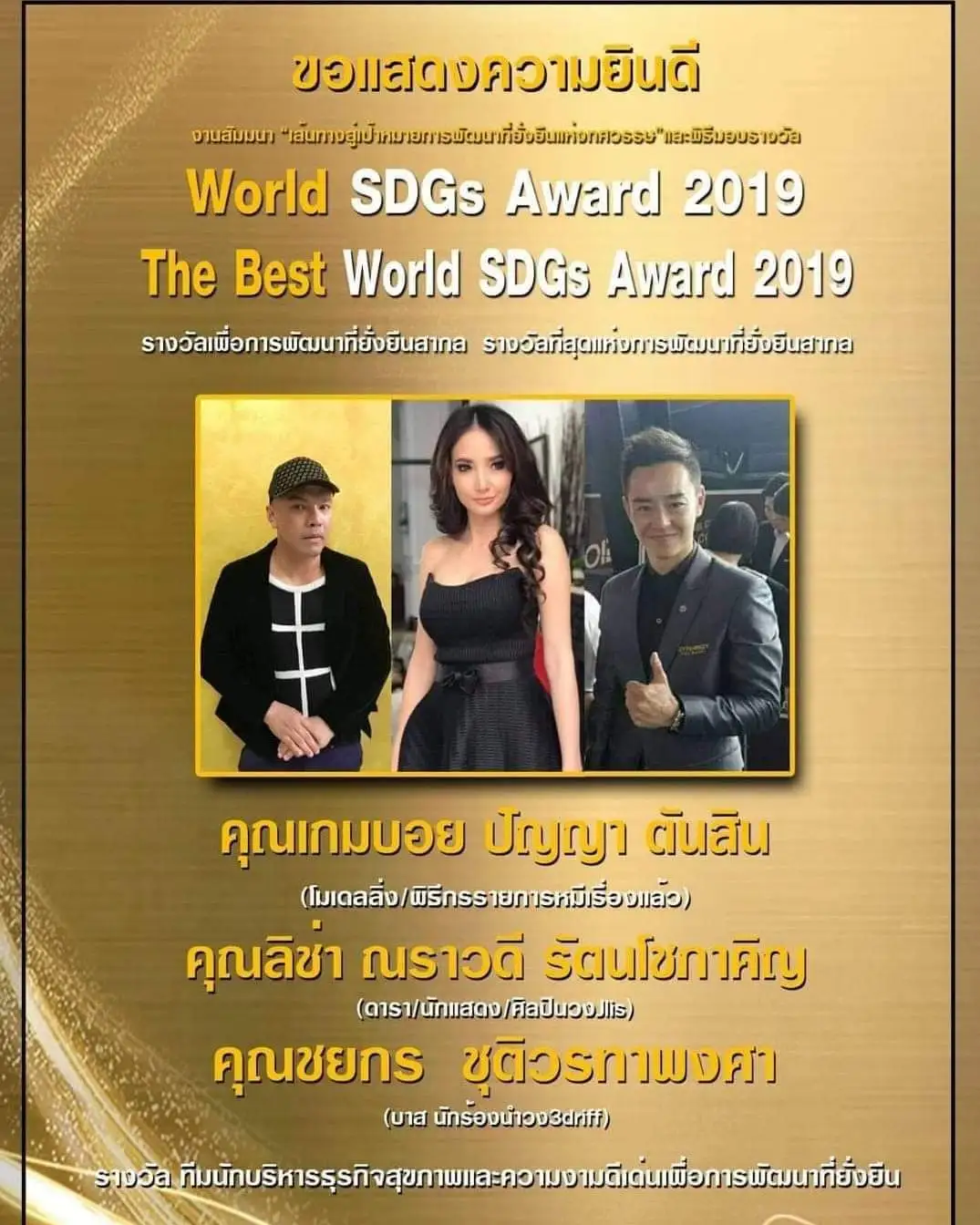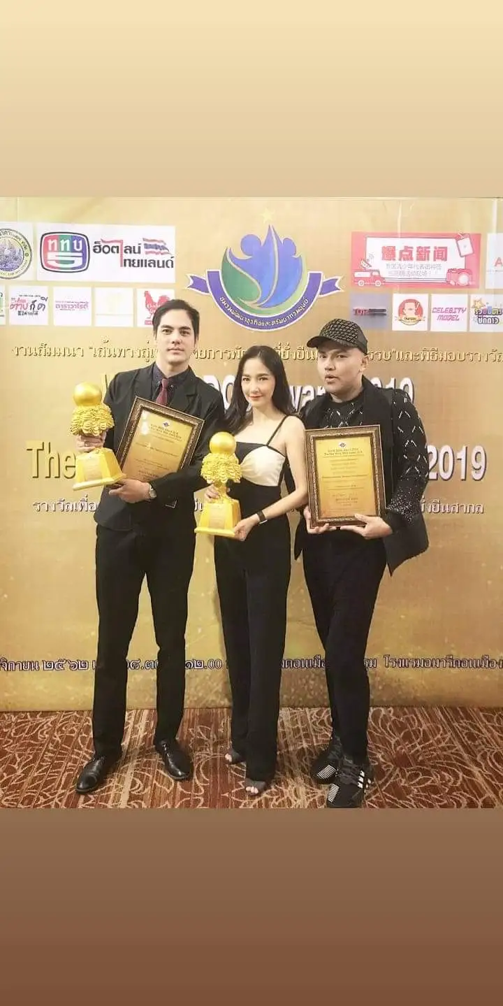 ตบเท้าเข้ารับรางวัลอันทรงเกรียรติ Best SDEs เพื่อการพัฒนาที่ยั่งยืน จากซ้ายไปขวา >น้องหนักแน่น #วัยซน ( ดารา นักแสดง ผกก.)>น้อง ริช่า (ดารา/นักแสดง/นักร้อง) >>> พี่ เกมบอย ( โมเดลลิ่ง/ผจก.ประกวดนางงาม)
