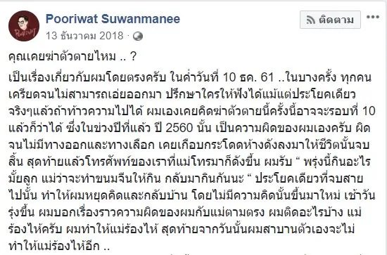 ทั้งนี้เมื่อปีที่ผ่านมา คิว ภูริวัฒน์ สุวรรณมณี ได้เคยโพสต์เฟซบุ๊กส่วนตัว เกี่ยวกับการฆ่าตัวตาย โดยระบุหัวเรื่องว่า