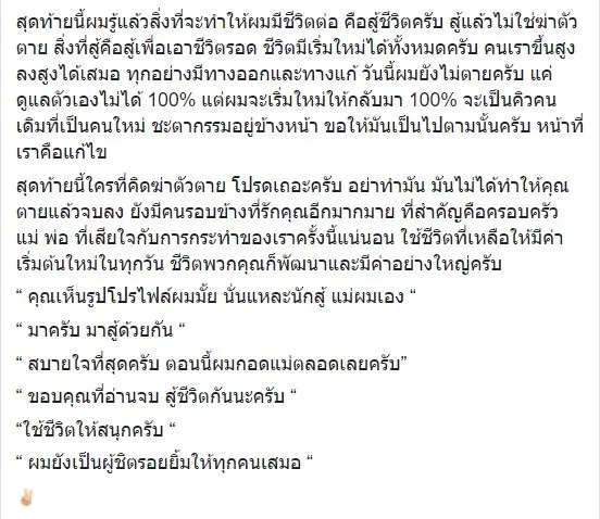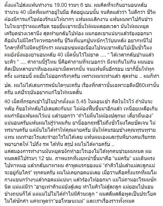 “ คุณเคยฆ่าตัวตายไหม .. ? ” พร้อมบอกว่าตนเอง เคยคิดฆ่าตัวตายนี้เป็นรอบที่ 10 แล้ว เคยเกือบกระโดดห้างดังลงมาให้เสียชีวิต หลังบางครั้งเครียดจนไม่สามารถเอ่ยออกมา ปรึกษาใครให้ฟังได้แม้แต่ประโยคเดียว