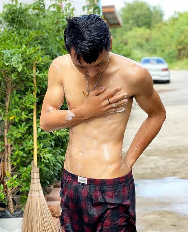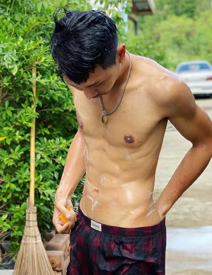 โดนใจแม่ๆ!! ผจก.ส่วนตัวโพสต์รูป “ตรี”นุ่งกางเกงลายสก๊อตแดงดำตัวเดียว อาบน้ำจากสายยาง