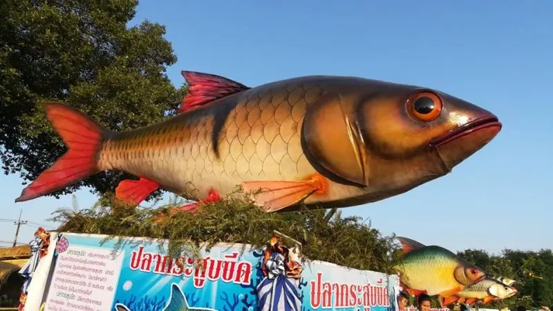 สำหรับไฮไลท์ ของงานนอกจากจะมีการร่วมฟ้อนรำศิลปวัฒนธรรมท้องถิ่นของชาวบ้านในพื้นที่ 9 ตำบล ในพิธีเปิดงานเมื่อคืนที่ผ่านมา ที่ขาดไม่ได้ คือ การร่วมแรงร่วมใจกัน ประดิษฐ์หุ่นปลายักษ์ มาร่วมประชันความสวยงามทุกปี โดยชาวบ้านได้มีการ ใช้แนวคิดริเริ่มสร้างสรรค์ ทำหุ่นปลาขนาดยักษ์ มานานกว่า 10 ปี จากพื้นฐานหุ่นปลาธรรมดาร จนกระทั่งปัจจุบันมีการพัฒนา ให้เกิดความสวยงาม ทั้งการใช้วัสดุอุปกรณ์ สีสัน เน้นความสวยงาม สมจริง และยังสามารถพัฒนาให้หุ่นปลาขนาดยักษ์ หลากหลายชนิดพันธุ์ปลาน้ำโขง สามารถขยับตัวได้ เสมือนแหวกว่ายไปในน้ำที่สวยงามลงตัว เป็นธรรมชาติ ซึ่งมีการจัดขบวนแห่ รวม 9 ตำบล ร่วมการประกวด ประชันความสวยงาม โดดเด่น อวดสายตานักท่องเที่ยว ได้ชื่นชม ความสวยงามอลังการ ตื่นตา สร้างความประทับใจให้กับประชาชน นักท่องเที่ยว เป็นอย่างมาก ควบคู่กับการแสดงขบวนแห่วิถีชีวิตประเพณีท้องถิ่น และซุ้มวิถีชีวิตวัฒนธรรมประเพณีท้องถิ่นชาวลุ่มน้ำสงคราม ที่จะเป็นการกระตุ้น สร้างจิตสำนึกให้ ร่วมกัน อนุรักษ์ธรรมชาติ สิ่งแวดล้อม และพันธ์ปลาน้ำโขงนานาชนิด ที่เสี่ยงสูญพันธ์