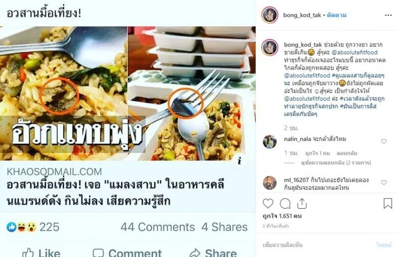 เมื่อไม่นานนี้ในโลกโซเชียลมีประเด็นที่หนุ่มโพสต์ข้อความและภาพของอาหารคลีนแบรนด์ดังที่มีแมลงสาบอยู่ด้านในกล่อง หลังจากที่โพสต์ข้อความทางเจ้าหน้าที่ผู้ดูแลได้ทำการขอโทษกับผู้เสียหายและพร้อมที่จะที่จะชดเชยอาหารให้ใหม่ 1 ชุด แต่ผู้เสียหายปฏิเสธเพราะไม่ต้องการที่จะรับประทานต่อแล้ว พร้อมกับต้องการให้ทางเจ้าของแบรนด์สินค้าชี้แจงสิ่งที่เกิดขึ้นและขอโทษผู้เสียหาย
