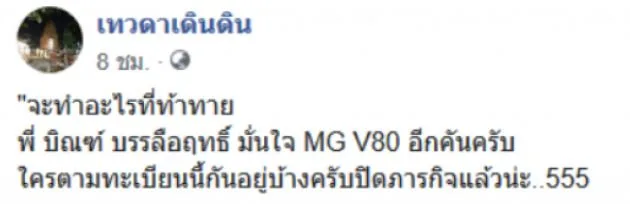 ล่าสุดเมื่อวันที่ 12 ธันวาคม 2562 เพจเทวดาเดินดิน ได้โพสต์ภาพพร้อมข้อความระบุว่า “จะทำอะไรที่ท้าทาย พี่ บิณฑ์ บรรลือฤทธิ์ มั่นใจ MG V80 อีกคันครับ ใครตามทะเบียนนี้กันอยู่บ้างครับปิดภารกิจแล้วนะ 555”