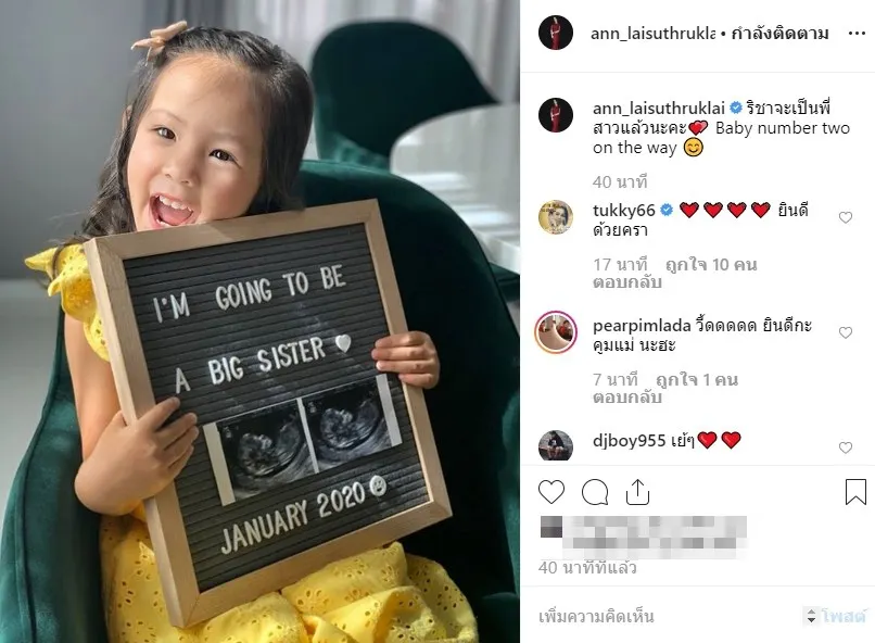 เเละก่อนหน้านี้ ก็นับว่าเป้นข่าวดีต้อนรับวันนี้ เมื่อสาว แอน อลิชา ได้ออกมาประกาศข่าวดีว่า ตนเองนั้นได้ตั้งท้องลูกคนที่ 2 เเล้วนั่นเอง ซึ่งงานนี้ สาวแอน ได้โพสต์แคปชั่นว่า ริชาจะเป็นพี่สาวแล้วนะคะ Baby number two on the way
