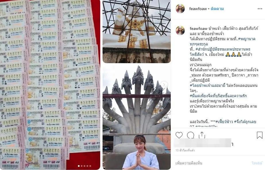 และในวันนี้ เฟี้ยว์ฟ้าว จึงได้ถูกเลข 97 จำนวน80ใบ ตามที่.. พญานาคได้มาในนิมิต ลูกคนนี้จะนำทุกบาท สร้างพระพุทธเจ้าทันใจองค์ที่109 ตามเจตนาของ พญานาคทุกๆตระกูล และ พญานาคทุกพระองค์ รับบุญนี้เน้อทุกคนเน้อกัลยาณมิตรทุกท่าน บุญของ พญานาค บุญที่ท่านช่วยสาน ส่งบุญนี้ถึงพวกเราทุกๆคน สาธุๆ