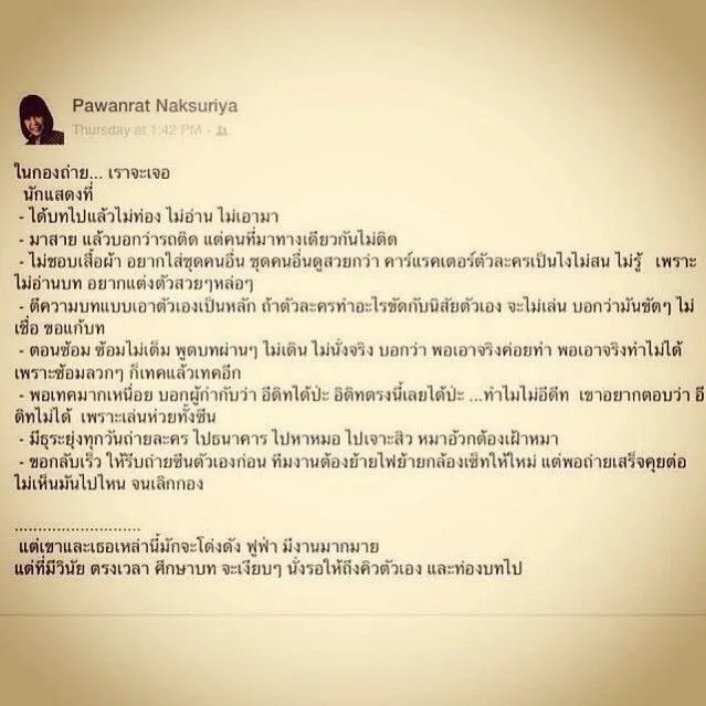 วานนี้ (17 ธ.ค.) เฟซบุ๊กของ เหมี่ยว ปวันรัตน์ นาคสุริยะ พิธีกรและนักแสดง ได้โพสต์ข้อความลงในเฟซบุ๊กส่วนตัว หลังจากทนไม่ไหวกับพฤติกรรมของนักแสดงรายหนึ่ง มาสาย ไม่เคยท่องบท พอบทไม่เข้ากับตัวเองก็บอกให้แก้บท โดยเพจ ฉันคือตัวประกอบ ได้ออมาโพสต์ข้อความที่ เหมี่ยว ปวันรัตน์ ได้โพสต์เอาไว้ทั้งหมดดังนี้