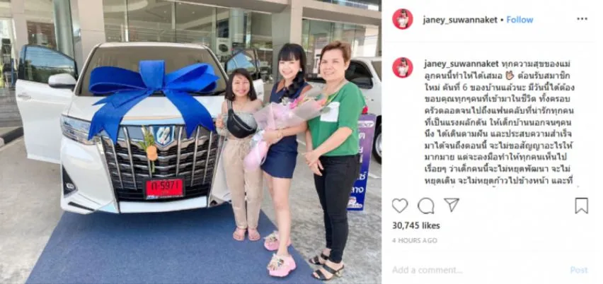 ล่าสุดเจนนี่ได้ออกรถอีกแล้ว เป็นรถคันที่ 6 โดยเจ้าตัวได้โพสต์ภาพผ่านอินสตาแกรมส่วนตัวที่ใช้ชื่อว่า janey suwannaket พร้อมระบุข้อความว่า “ทุกความสุขของแม่ ลูกคนนี้ทำให้ได้เสมอ ต้อนรับสมาชิกใหม่ คันที่ 6 ของบ้านแล้วนะ มีวันนี้ได้ต้องขอบคุณทุกๆคนที่เข้ามาในชีวิต