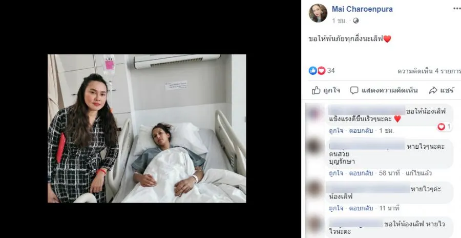 ล่าสุด ใหม่ เจริญปุระ ได้โพสต์ภาพคู่กับหลานสาวที่ยังนอนรักษาตัวบนเตียงคนไข้ พร้อมระบุข้อความว่า “ขอให้พ้นภัยทุกสิ่งนะเลิฟ” ซึ่งทำให้ชาวเน็ตเข้ามาแสดงความคิดเห็นกันอย่างต่อเนื่อง โดยส่วนใหญ่เข้ามาอวยพรขอให้น้องเลิฟมัจฉาหายจากอาการบาดเจ็บโดยเร็ว