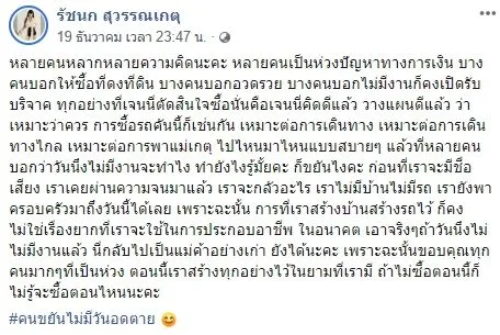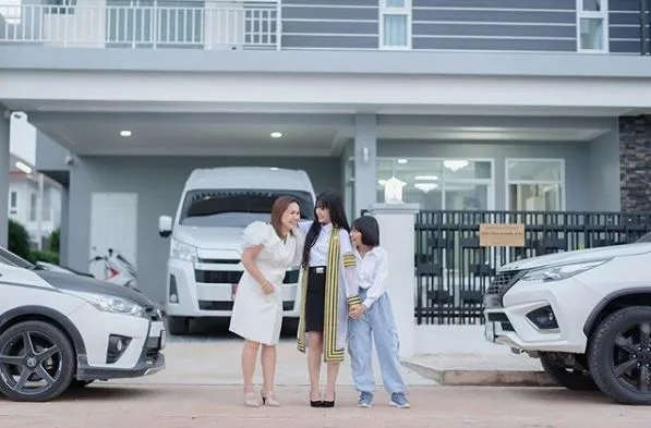 แล้วที่หลายคนบอกว่าวันนึงไม่มีงานจะทำไง ทำยังไงรู้มั้ยคะ ก็ขยันไงคะ ก่อนที่เราจะมีชื่อเสียง เราเคยผ่านความจนมาแล้ว เราจะกลัวอะไร เราไม่มีบ้านไม่มีรถ เรายังพาครอบครัวมาถึงวันนี้ได้เลย เพราะฉะนั้น การที่เราสร้างบ้านสร้างรถไว้ ก็คงไม่ใช่เรื่องยากที่เราจะใช้ในการประกอบอาชีพ ในอนาคต เอาจริงๆถ้าวันนึงไม่ไม่มีงานแล้ว นี่กลับไปเป็นแม่ค้าอย่างเก่า ยังได้นะคะ เพราะฉะนั้นขอบคุณทุกคนมากๆที่เป็นห่วง ตอนนี้เราสร้างทุกอย่างไว้ในยามที่เรามี ถ้าไม่ซื้อตอนนี้ก็ไม่รู้จะซื้อตอนไหนนะคะ