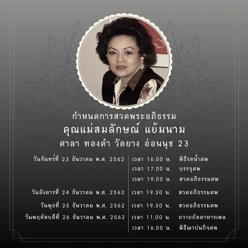 พร้อมทั้งโพสต์ภาพของคุณแม่สมลักษณ์ ซึ่งเป็นกำหนดการสวดพระอภิธรรมศพ ทางครอบครัวได้กำหนดวันที่ตั้งแต่ 23 ธ.ค.- 25 ธ.ค. และพิธีฌาปณกิจจะจัดขึ้นในวันที่ 26 ธ.ค. ที่ศาลาทองคำ ณ วัดยาง อ่อนนุช 23 ทางเราขอแสดงความเสียใจด้วยนะคะ