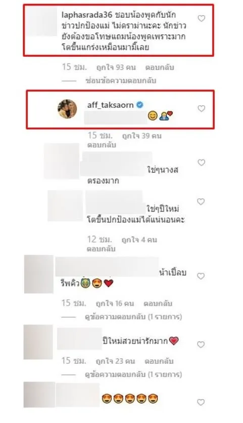 เเละล่าสุด สาวแอฟ ทักษอร นั้นก็รีบตอบกลับ หลังชาวเน็ตพูดถึงพฤติกรรม น้องปีใหม่ ขณะให้สัมภาษณ์ ปกป้องแม่ โดยชาวเน็ตนั้นก็ได้เเสดงความคิดเห็นว่า ชอบน้องพูดกับนักข่าวปกป้องแม่ ไม่ดราม่านะคะ นักข่าวยังต้องขอโทษแถมน้องพูดเพราะมากโตขึ้นแกร่งเหมือนมามี๊เลย