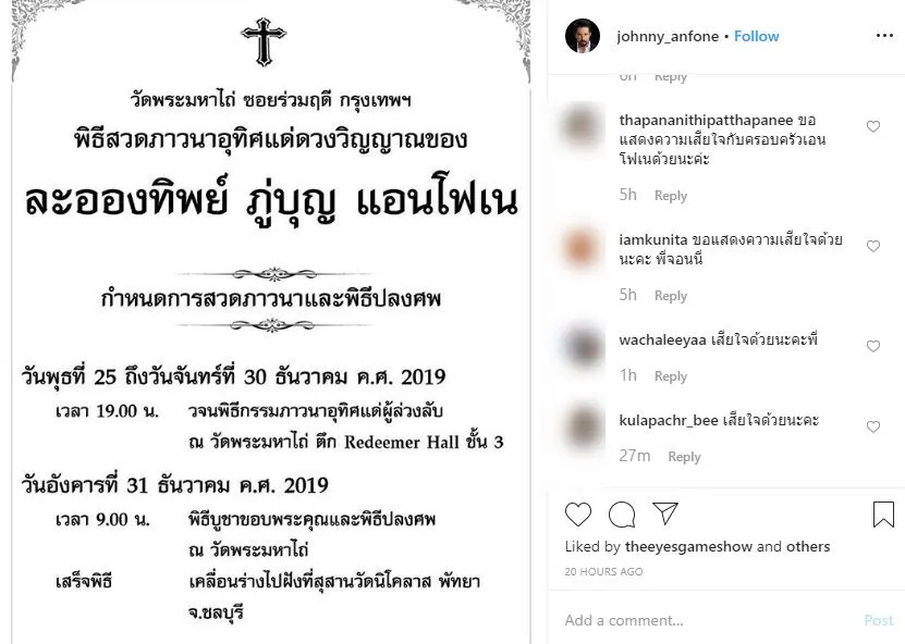 นับเป็นข่าวเศร้าในวงการบันเทิงไทยอีกครั้ง เมื่อ จอนนี่ แอนโฟเน ได้แจ้งข่าวการจากไปอย่างไม่มีวันหวนกลับของ คุณแม่ละอองทิพย์ ภู่บุญ แอนโฟเน ซึ่ง จอนนี่ แอนโฟเน ได้โพสต์ภาพการกำหนดงานของคุณแม่เอาไว้ดังนี้