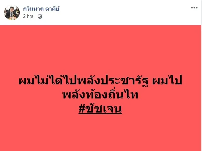 น.ส.กวินนาถ ตาคีย์ ส.ส.ชลบุรี ที่ถูกที่ประชุมร่วมกรรมการบริหารและ ส.ส. พรรคอนาคตใหม่มีมติขับออกจากพรรคได้เผยแพร่ข้อความในเฟซบุ๊ก กวินนาถ ตาคีย์ ระบุ "ผมไม่ได้ไปพลังประชารัฐ ผมไปพลังท้องถิ่นไท #ชัชเจน"