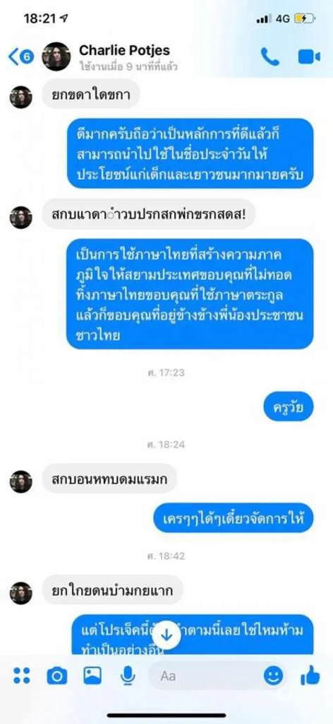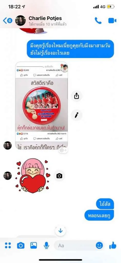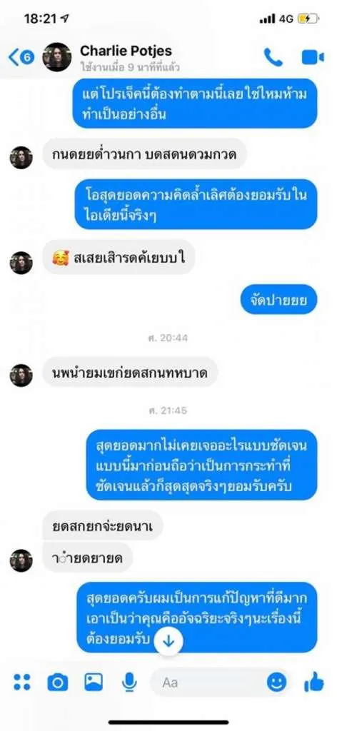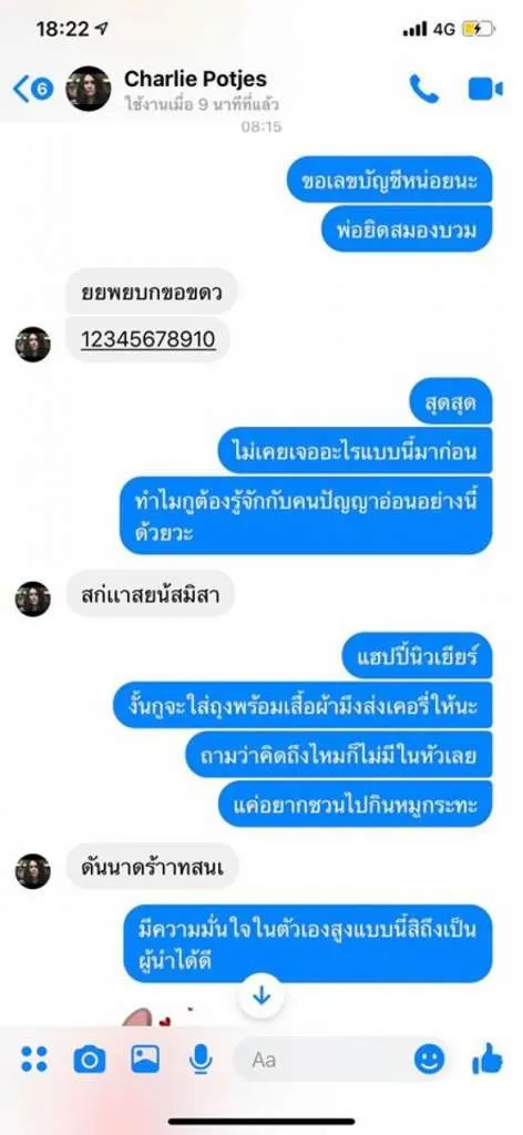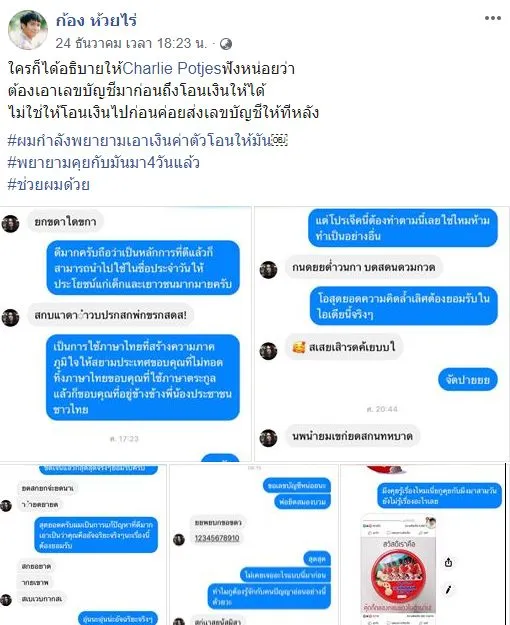 โดยก้องยังได้โพสต์แชทการสนทนาระหว่างหนุ่มแน็กกับตนพร้อมทั้งข้อความระบุว่า… “ใครก็ได้อธิบายให้Charlie Potjesฟังหน่อยว่า ต้องเอาเลขบัญชีมาก่อนถึงโอนเงินให้ได้ไม่ใช่ให้โอนเงินไปก่อนค่อยส่งเลขบัญชีให้ทีหลัง#ผมกำลังพยายามเอาเงินค่าตัวโอนให้มัน#พยายามคุยกับมันมา4วันแล้ว#ช่วยผมด้วย” เอาเป็นว่าแชทนี้จะปวดหัวขนาดไหนไปอ่านกันเลย