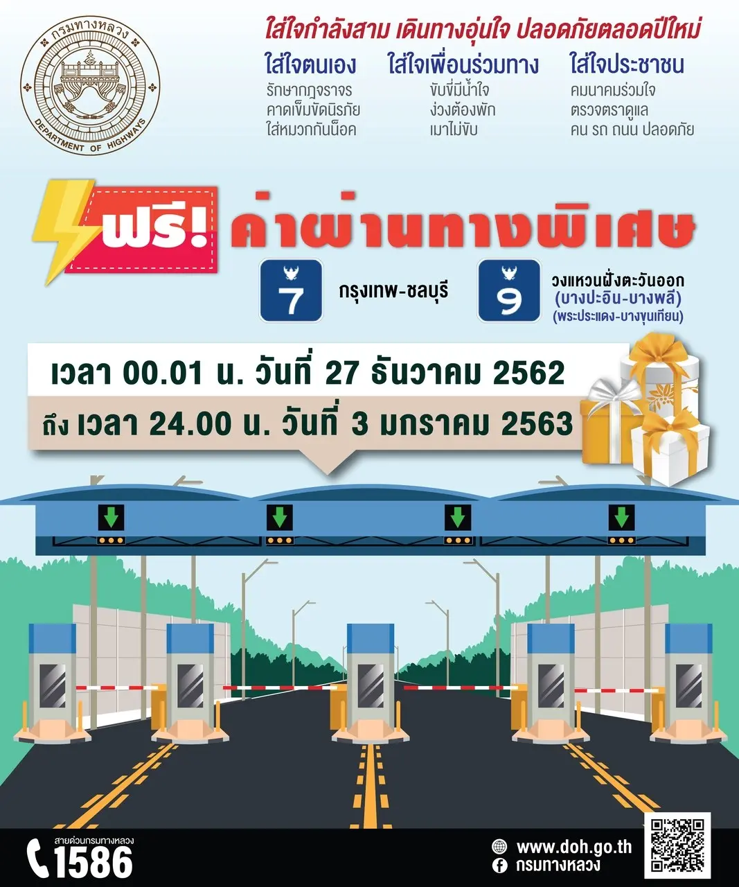 การคมนาคมทางถนนได้ยกเว้นค่าผ่านทาง 4 เส้นทาง ได้แก่ ยกเว้นค่าธรรมเนียมผ่านทางบนทางหลวงพิเศษหมายเลข 7 และ 9 สายถนนวงแหวนรอบนอกกรุงเทพมหานคร (ถนนกาญจนาภิเษก) ตอนบางปะอิน-บางพลี และตอนพระประแดง-บางแค ช่วงพระประแดง-ต่างระดับบางขุนเทียน และยกเว้นค่าผ่านทางพิเศษในทางพิเศษบูรพาวิถีและทางพิเศษกาญจนาภิเษก (บางพลี-สุขสวัสดิ์) ตั้งแต่วันที่ 27 ธันวาคม 2562 เวลา 00.01 น. ถึงวันที่ 3 มกราคม 2563 เวลา 24.00 น. พร้อมให้ส่วนลดค่าผ่านทางพิเศษสำหรับระบบเก็บค่าผ่านทางพิเศษอัตโนมัติ ร้อยละ 5 ต่อเที่ยวทุกด่านเก็บค่าผ่านทาง ตลอด 24 ชั่วโมง โดยเริ่มดำเนินการต่อจากการยกเว้นค่าผ่านทางพิเศษฯ หลังเทศกาลปีใหม่ไปแล้วต่อไปอีกเป็นระยะเวลา 1 เดือน