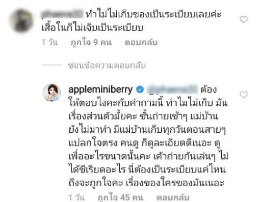 ทำเอาคุณแม่ลูกอ่อนได้เข้ามาตอบกลับแบบจุกๆ ไปว่า “ต้องให้ตอบไงคะกับคำถามนี้ ทำไมไม่เก็บ มันเรื่องส่วนตัวมั้ยคะ ฉันถ่ายเช้าๆ แม่บ้านยังไม่มาทำ มีแม่บ้านเก็บทุกวันตอนสายๆ แปลกใจตรง คนดู ก็ดูละเอียดดีเนอะ ดูเพื่ออะไรขนาดนั้นคะ เขาถ่ายกันเล่นๆ ไม่ได้ซีเรียดอะไร นี่ต้องเป็นระเบียบแค่ไหน ถึงจะถูกใจคะ เรื่องของใครของมันเนอะ”