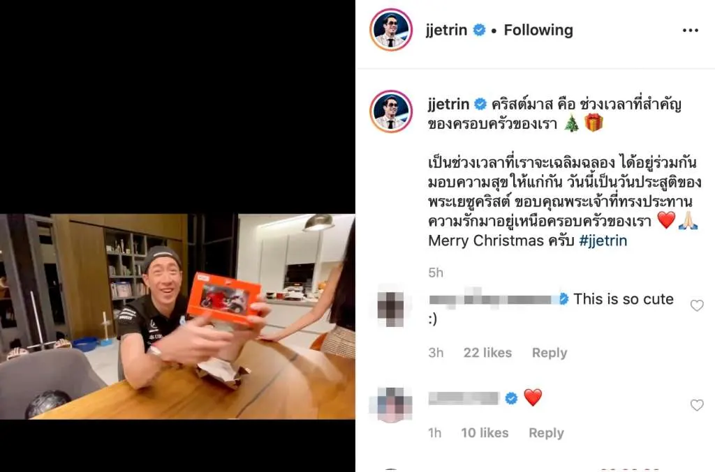 “คริสต์มาส คือ ช่วงเวลาที่สำคัญของครอบครัวของเรา เป็นช่วงเวลาที่เราจะเฉลิมฉลอง ได้อยู่ร่วมกัน มอบความสุขให้แก่กัน วันนี้เป็นวันประสูติของพระเยซูคริสต์ ขอบคุณพระเจ้าที่ทรงประทานความรักมาอยู่เหนือครอบครัวของเรา Merry Christmas ครับ #jjetrin”
