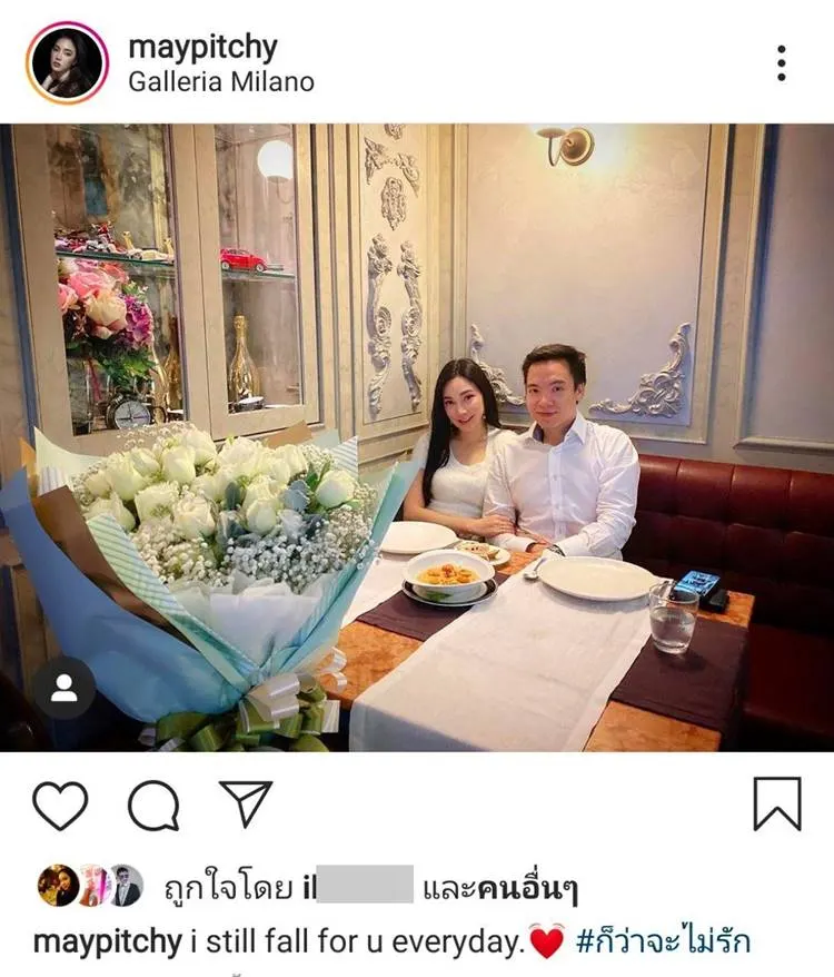 โดยล่าสุด เมื่อสาว เมย์ พิชนาฎ ลงรูปคู่ควงแขนไฮโซบิ๊ก ในขณะที่รับประทานอาหาร ท่ามกลางบรรยากาศสุดโรแมนติก พร้อมกับมีช่อดอกไม้กุหลาบช่อโตวางอยู่ด้วย พร้อมกับระบุข้อความว่า ” I still fall for u everyday”