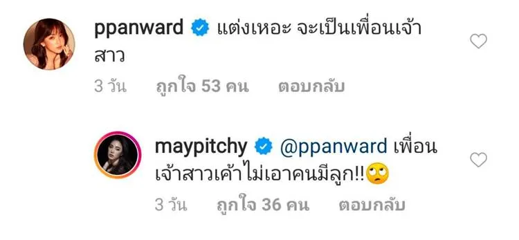 ทำเอาเพื่อนซี้ในแก๊งอย่าง เป้ย ปานวาด รีบเข้ามาคอมเมนต์ทันทีว่า ” แต่งเหอะ จะเป็นเพื่อนเจ้าสาว” ก่อนที่โดนดับฝันเมย์เข้ามาตอบกลับว่า ” เพื่อนเจ้าสาวเค้าไม่เอาคนมีลูก!!”