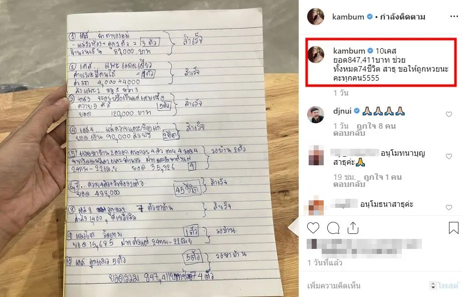 อีกทั้งงานนี้ สาวแก้มบุ๋ม ยังได้โพสต์แคปชั่นว่า 10 เคสยอด 847,411บาท ช่วยทั้งหมด 74 ชีวิต สาธุ ขอให้ถูกหวยนะคะทุกคน5555