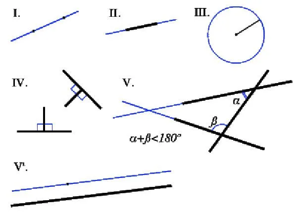 P5 ถ้าเส้นตรงเส้นหนึ่งตัดผ่านเส้นตรงอีกสองเส้นแล้วทําให้มุมภายในที่อยู่ข้างเดียวกันของเส้นตัดรวมกันน้อยกว่า 2 มุมฉาก ถ้าต่อเส้นตรงทั้งสองออกไปเรื่อยๆเส้นตรงทั้งสองจะตัดกันทางด้านที่มีมุมรวมกันน้อยกว่า 2 มุมฉาก