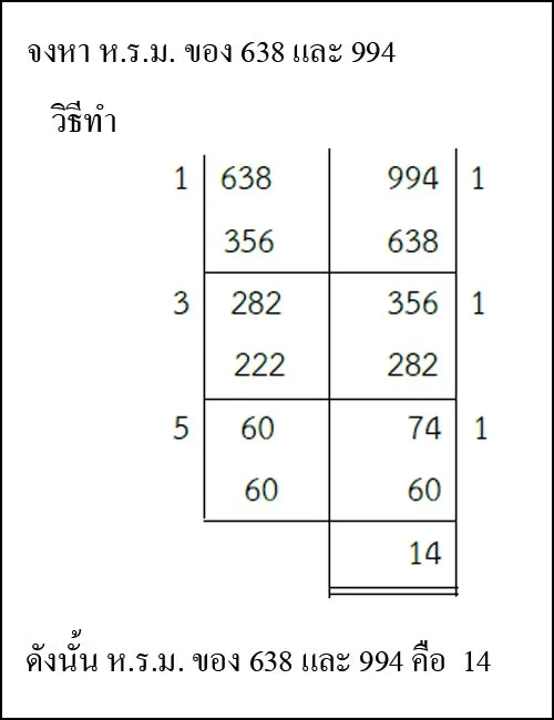 3. ตัวหารร่วมมาก (ห.ร.ม.) – ห.ร.ม. ของจำนวนเต็มสองจำนวนคือจำนวนเต็มที่มากที่สุดที่หารทั้งสองจำนวนลงตัว เราสามารถหา ห.ร.ม. ได้หลายวิธี วิธีพื้นฐานคือให้แยกตัวประกอบของทั้งสองจำนวนแล้วนำตัวประกอบที่ซ้ำกันของทั้งสองจำนวนทุกตัวมาคูณกันจะได้เป็น ห.ร.ม. แต่วิธีนี้จะทำได้สำหรับจำนวนที่มีค่าน้อยๆเท่านั้น หากเป็นจำนวนที่มีค่าจำนวนมากๆการแยกตัวประกอบจะยุ่งยากและมีจำนวนตัวประกอบมากเกินไป ยุคลิดได้คิดค้นวิธีหา ห.ร.ม. ที่มีประสิทธิภาพมากและใช้ได้กับทุกจำนวนเรียกว่าขั้นตอนวิธีแบบยุคลิด (Euclidean Algorithm) วิธีการก็ไม่ซับซ้อนเริ่มจากใช้จำนวนที่มีค่าน้อยกว่าเป็นตัวหารนำไปหารจำนวนที่มีค่ามากกว่า เหลือเศษเท่าไรใช้เศษนั้นเป็นตัวหารนำไปหารตัวหารก่อนหน้า ทำไปเรื่อยๆจนกว่าจะหารลงตัว ตัวหารที่ทำให้การหารลงตัวคือ ห.ร.ม. รูปด้านล่างแสดงวิธีหา ห.ร.ม. ของ 638 และ 994 ขั้นตอนวิธีแบบยุคลิด ส่วน ค.ร.น. ก็สามารถหาได้จากผลคูณของจำนวนทั้งสองหารด้วย ห.ร.ม.