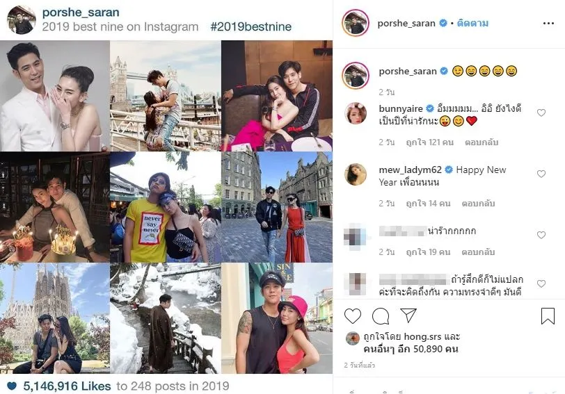 ล่าสุด ทางหนุ่มพอร์ชก็เพิ่งจะได้โพสต์ภาพ ที่เป็นการแชร์ภาพจากโพสต์ที่ดีที่สุดทั้งหมดในปี 2019 ลงในอินสตาแกรมส่วนตัว ซึ่งจะเห็นได้ว่ามีสาวดาวร่วมเฟรมอยู่ด้วยเกือบจะทุกภาพ
