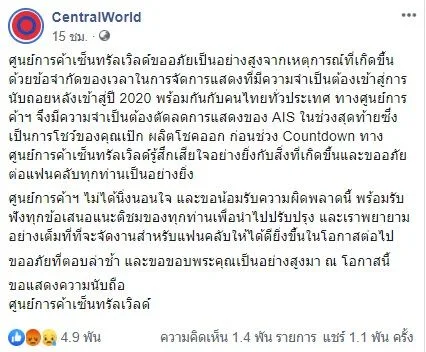 ต่อมา ศูนย์การค้าเซ็นทรัลเวิลด์ขออภัยเป็นอย่างสูงจากเหตุการณ์ที่เกิดขึ้นด้วยข้อจำกัดของเวลาในการจัดการแสดงที่มีความจำเป็นต้องเข้าสู่การนับถอยหลังเข้าสู่ปี 2020 พร้อมกันกับคนไทยทั่วประเทศ ทางศูนย์การค้าฯ จึงมีความจำเป็นต้องตัดลดการแสดงของ AIS ในช่วงสุดท้ายซึ่งเป็นการโชว์ของคุณเป๊ก ผลิตโชคออก ก่อนช่วง Countdown ทางศูนย์การค้าเซ็นทรัลเวิลด์รู้สึกเสียใจอย่างยิ่งกับสิ่งที่เกิดขึ้นและขออภัยต่อแฟนคลับทุกท่านเป็นอย่างยิ่งศูนย์การค้าฯ ไม่ได้นิ่งนอนใจ และขอน้อมรับความผิดพลาดนี้ พร้อมรับฟังทุกข้อเสนอแนะติชมของทุกท่านเพื่อนำไปปรับปรุง และเราพยายามอย่างเต็มที่ที่จะจัดงานสำหรับแฟนคลับให้ได้ดียิ่งขึ้นในโอกาสต่อไป