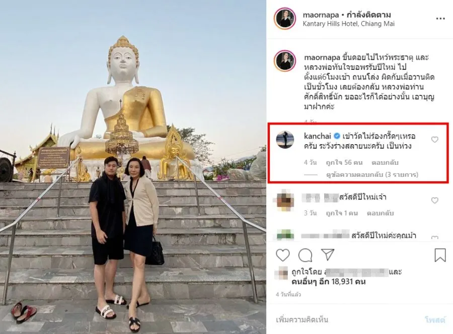 จากนั้นทางด้านรุ่นน้องคนสนิท หนุ่ม กรรชัย ก็ได้ออกมาเเสดงความคิดเห็นกลางไอจี โดย หนุ่ม กรรชัย ได้คอมเมนต์เเซวเเรงว่า เข้าวัดไม่ร้องกรี๊ดๆเหรอครับ ระวังร่างสลายนะครับ เป็นห่วง