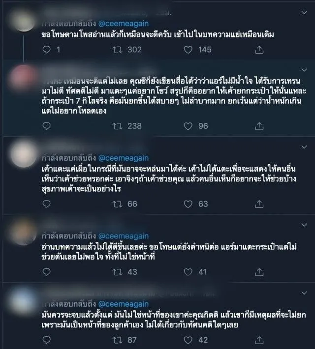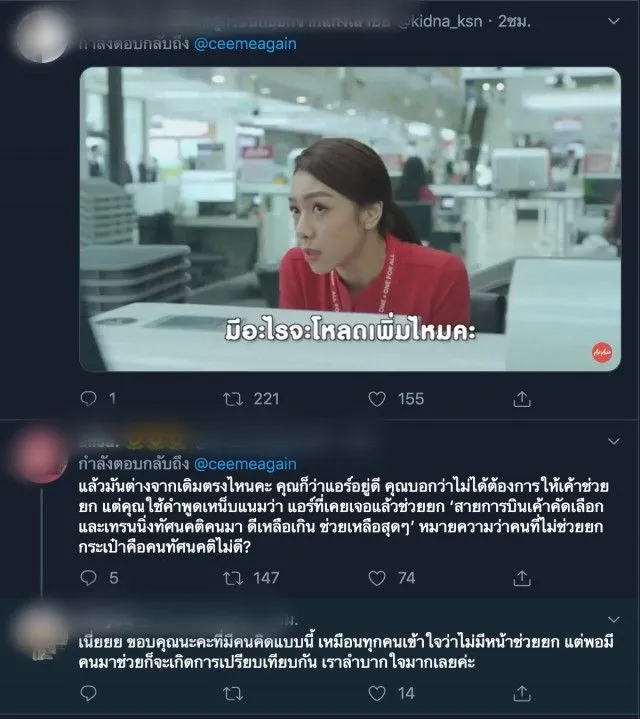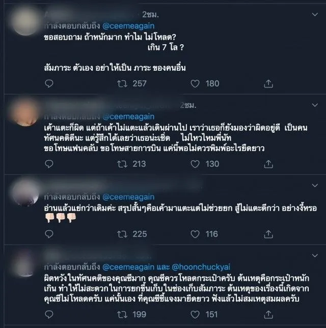 หลังจากทวิตเตอร์ข้อความดังกล่าวเผยแพร่ออกไป ทำให้เป็นกระแสวิจารณ์ โดยมีชาวเน็ตมาอธิบายว่า พนักงานบนเครื่องบินไม่มีหน้าที่ยกกระเป๋า และแนะนำหากยกกระเป๋าไม่ไหว ให้โหลดกระเป๋าใต้ท้องเครื่อง