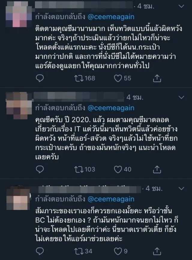 หลังจากทวิตเตอร์ข้อความดังกล่าวเผยแพร่ออกไป ทำให้เป็นกระแสวิจารณ์ โดยมีชาวเน็ตมาอธิบายว่า พนักงานบนเครื่องบินไม่มีหน้าที่ยกกระเป๋า และแนะนำหากยกกระเป๋าไม่ไหว ให้โหลดกระเป๋าใต้ท้องเครื่อง