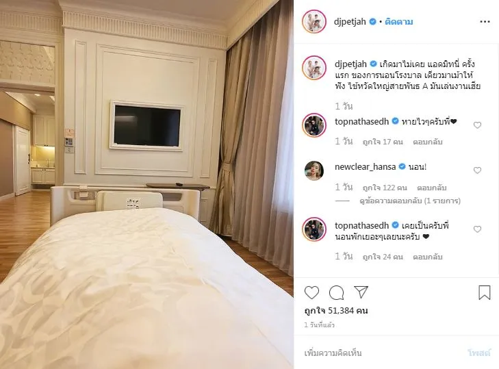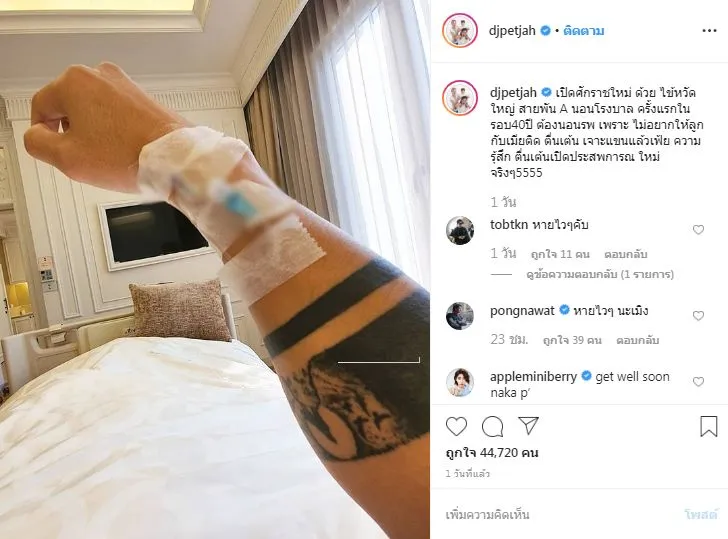 งานนี้แฟนๆเข้ามาคอมเมนต์ส่งกำลังใจเป็นจำนวนมาก พร้อมทั้งอวยพรให้หนุ่มเพชรจ้าหายจากอาการโดยเร็ววัน