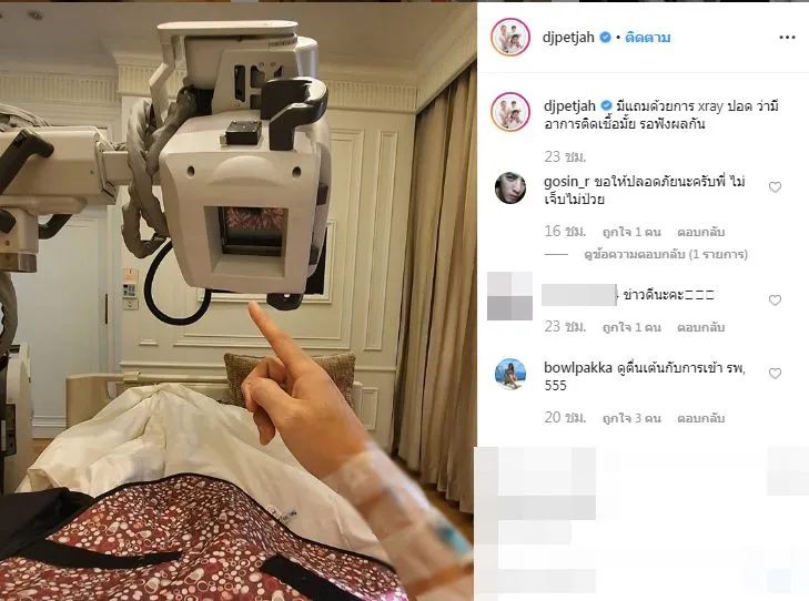 ล่าสุด ( 6 ม.ค 63 ) ดีเจเพชรจ้า ก็ได้ออกมาโพสต์ภาพในขณะที่กำลังนอนรักษาตัวที่โรงพยาบาล พร้อมกับระบุข้อความว่า ” เปิดศักราชใหม่ ด้วย ไข้หวัดใหญ่ สายพัน A นอนโรงบาล ครั้งแรกในรอบ40ปี ต้องนอนรพ เพราะ ไม่อยากให้ลูกกับเมียติด ตื่นเต้น เจาะแขนแล้วเฟ้ย ความรุ้สึก ตื่นเต้นเปิดประสพการณ ใหม่จริงๆ5555″ ทั้งนี้ เจ้าตัวได้เอ็กซเรย์ปอด เพื่อตรวจสอบว่ามีการอาการติดเชื้อหรือไม่