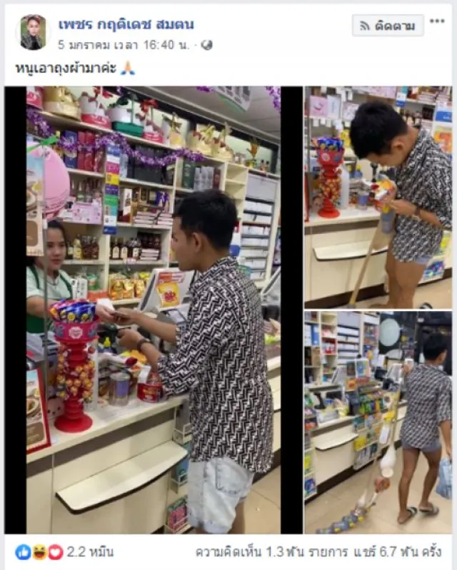 โดยหลังจากจ่ายเงินซื้อของเสร็จแล้ว ขนเพชรก็ก้มลงถอดกางเกงขาสั้นออกทันที เหลือแต่บ็อกเซอร์ จากนั้นก็ถอดถุงน่องออกมาอีก และลงมือนำของที่ซื้อยัดใส่ไปในถุงน่อง ทั้งน้ำดื่ม น้ำแข็ง คุกกี้ บะหมี่กึ่งสำเร็จรูป กล้วยหอม แชมพู และขนมอื่น ๆ อีกเพียบ จากนั้นก็หยิบกางเกงที่ถอดไว้ แล้วลากถุงน่องออกจากร้านไป ถุงน่องจึงกลายเป็นถุงผ้าชนิดยืดยาวพิเศษไปเลย