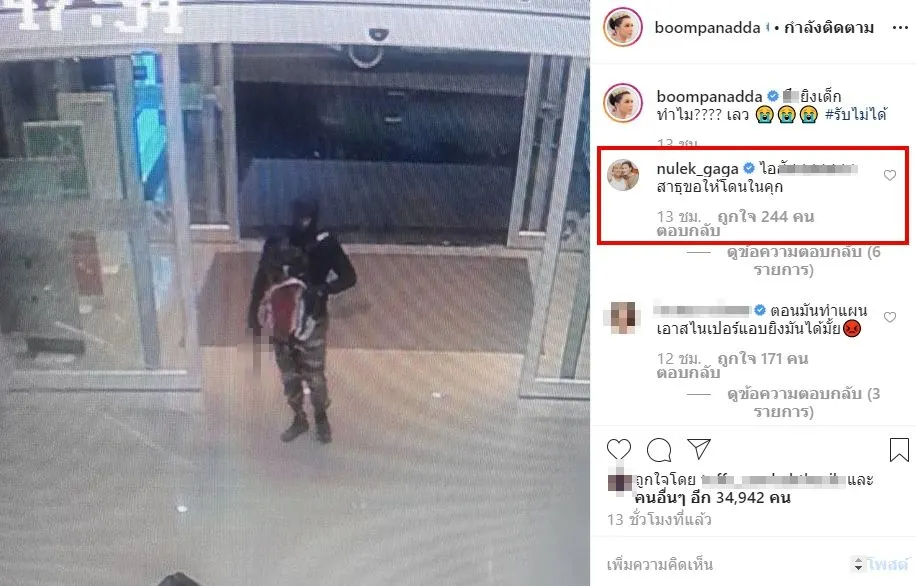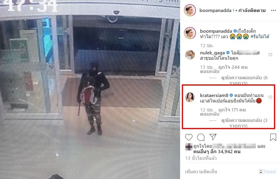 เเละล่าสุด สาวบุ๋ม ปนัดดา นั้นก็ได้โพสต์ลงไอจีระบุข้อความว่า มึ-ยิงเด็กทำไม???? เลว ซึ่งงานนี้ สาวกระเเต อาร์สยาม นั้นก็ได้โผล่กลางไอจี บุ๋ม ปนัดดา เดือดด่ายับโจรปล้นร้านทอง! โดยเธอนั้นได้ระบุข้อความว่า ตอนมันทำแผน เอาสไนเปอร์แอบยิงมันได้มั้ย