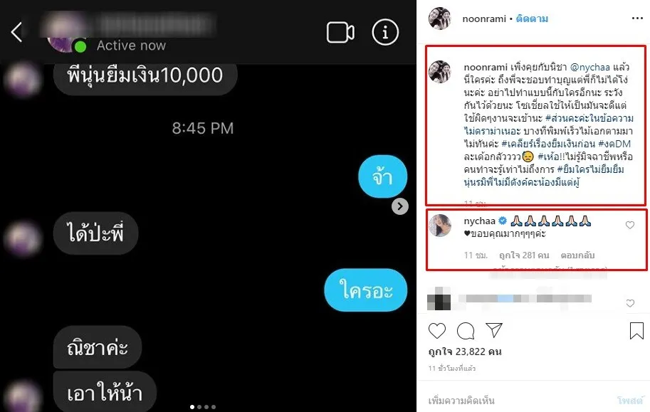 โดยสาวนุ่นยังได้โพสต์ข้อความว่า…เพิ่งคุยกับนิชา @nychaa แล้วนี่ใครค่ะ ถึงพี่จะชอบทำบุญแต่พี่ก็ไม่ได้โง่นะคะ อย่าไปทำแบบนี้กับใครอีกนะ ระวังกันไว้ด้วยนะ โซเชี่ยลใช้ให้เป็นมันจะดีแต่ใช้ผิดๆงานจะเข้านะ #ส่วนคะค่ะในข้อความไม่ดราม่าเนอะ บางทีพิมพ์เร็วไม้เอกตามมาไม่ทันค่ะ #เคลียร์เรื่องยืมเงินก่อน #งดDM ละเด้อกลัวววว #เห้อ!!ไม่รู้มิจฉาชีพหรือคนทำจะรู้เท่าไม่ถึงการ #ยืมใครไม่ยืมยืมนุ่นรมิพี่ไม่มีตังค์คะน้องมีแต่ผู้”