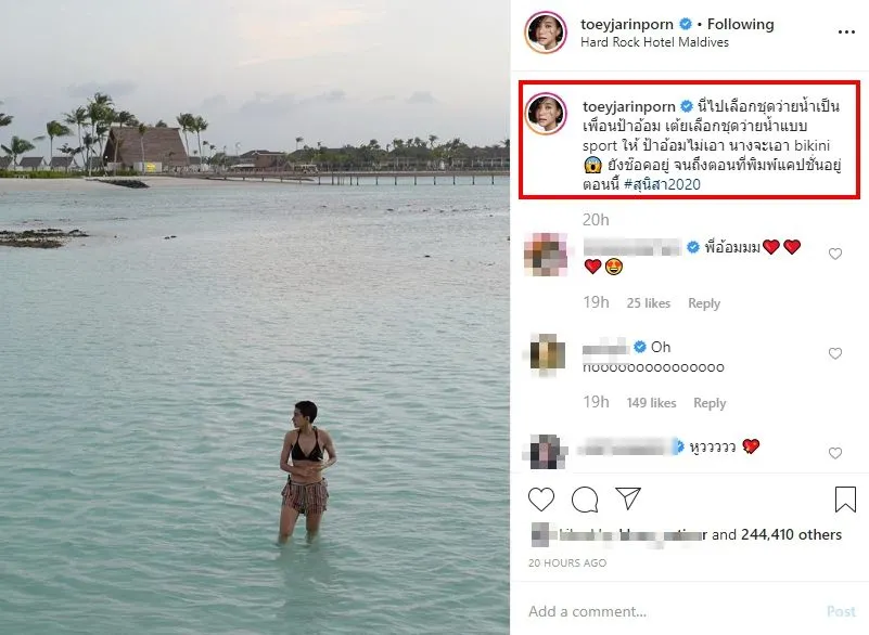 “ได้รับการตรวจสอบแล้ว นี่ไปเลือกชุดว่ายน้ำเป็นเพื่อนป้าอ้อม เต้ยเลือกชุดว่ายน้ำแบบ sport ให้ ป้าอ้อมไม่เอา นางจะเอา bikini ยังช๊อคอยู่ จนถึงตอนที่พิมพ์แคปชั่นอยู่ตอนนี้ #สุนิสา2020”