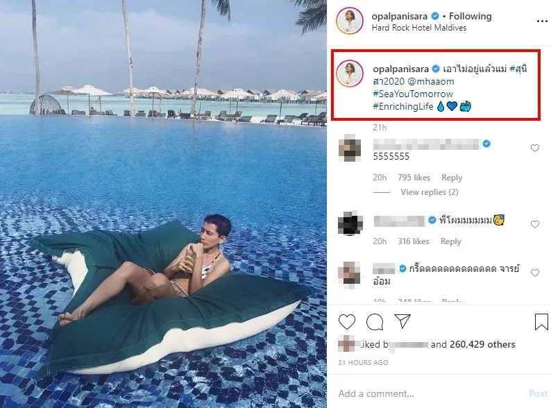 ทั้งนี้ล่าสุดทางด้าน “เต้ย จรินทร์พร จุนเกียรติ” หนึ่งคนที่ร่วมทริปนี้ก็ได้โพสต์ภาพ “อ้อม สุนิสา” ใส่บิกินี่ พร้อมกางเกงขาสั้น และแคปชั่นที่พูดแฉ”อ้อม สุนิสา” เมื่อ “สาวเต้ย”เลือกชุดว่ายน้ำแบบ sport ให้ ทว่า”อ้อม สุนิสา” เลือกใส่บิกินี่ตัวจิ๋วซะงั้น