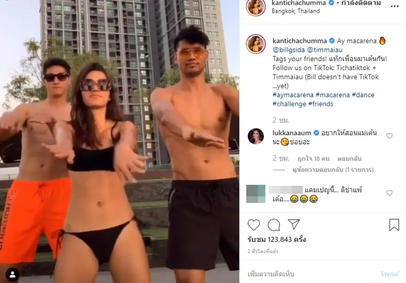 โดยล่าสุด สาวติช่า กินติชา ได้ออกมาโพสต์คลิปชวนเพื่อนๆ 2 หนุ่มหุ่นแซ่บ ออกมาเต้นเพลง Ay macarena ที่กำลังเป็นกระแสไวรัลในโลกออนไลน์อยู่ในขณะนี้ ซึ่งแต่ละคน ก็โชว์สเต็ปแดนซ์สุดแซ่บกระจาย จนแฟน ๆ เข้ามาคอมเมนต์กันเพียบว่า เผ็ดมาก ไม่มีใครยอมใครเลย บางรายยังบอกอีกว่า ไม่ได้มอง สาวติช่า เลย มัวแต่มองหนุ่ม ๆ ข้างหลัง ขนาด อุ้ม ลักขณา ยังเข้ามาคอมเมนต์บอกให้สอนแม่เต้นบ้าง